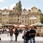 Fragment zachodniej i północnej pierzei Starego Rynku w kierunku ul. Zamkowej, w oddali Zamek Królewski (budynek Raczyńskiego) na Wzgórzu Przemysła, po 1960 roku