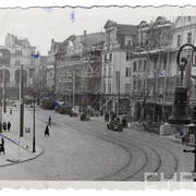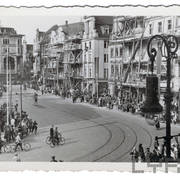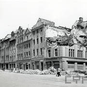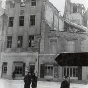 Łącznik między ratuszem (z lewej) a pruskim Nowym Ratuszem po zakończeniu działań wojennych, widoczne zniszczenia w obu budynkach od strony północnej i gruzy na płycie Starego Rynku07.07.1945