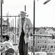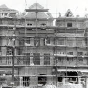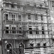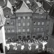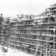 Rusztowania ustawione wokół ratusza w czasie prac rekonstrukcyjnych po zniszczeniach wojennych, na pierwszym planie fundamenty kamienicy narożnikowej stojącej wzdłuż ul. Wrocławskiej16.07.1952