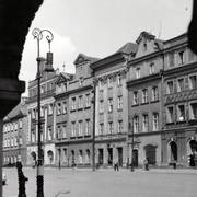 Ulica Jana Baptysty Quadro na Starym Rynku z modernistycznymi budynkami Galerii Miejskiej Arsenał (z lewej) i Wielkopolskiego Muzeum Wojskowego, w oddali Pałac Mielżyńskich w północnej pierzei rynku1966