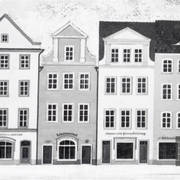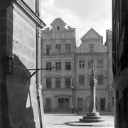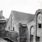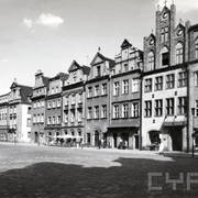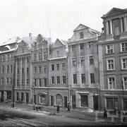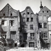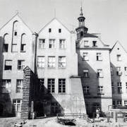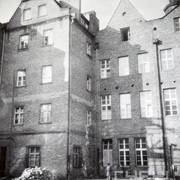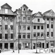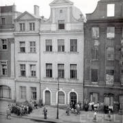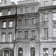 Podwórzowe elewacje szczytowe kamienic nr 42 (z blendami w szczycie) i 43 (z lizeną w szczycie) w pierzei wschodniej Starego Rynku między ulicami Wielką i Woźną05.1955