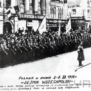 Herb Rzeczypospolitej (wyobrażenie herbu jeszcze przed formalną unią z Litwą, ale wzajemne relacje rozumiane już jako spójny organizm państwowy) podtrzymywany przez putta z koroną zamkniętą w kasetonie sklepienia Wielkiej Sieni ratusza1926–1939