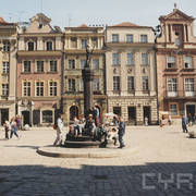Modernistyczny budynek Wielkopolskiego Muzeum Wojskowego pobudowany na terenie dawnych Sukiennic zniszczonych w czasie II wojny światowej, na pierwszym planie figura św. Jana Nepomucena1964