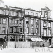 Zniszczony w czasie działań wojennych wschodni trakt Sukiennic, u dołu z lewej południowa bramka prowadząca na teren Sukiennic, w tle odbudowany ratusz09.1954