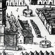 Zachodnia połać Starego Rynku z dwiema studzienkami w narożach, fragment widoku Poznania z dzieła Brauna i Hogenberga "Civitates orbis terrarum" wydanego w 1617 roku, tom VI