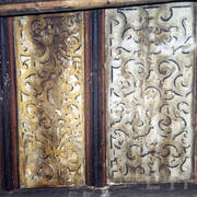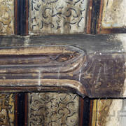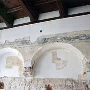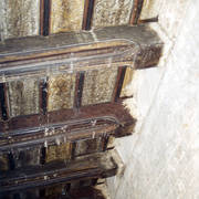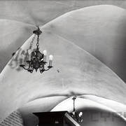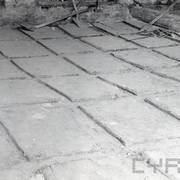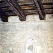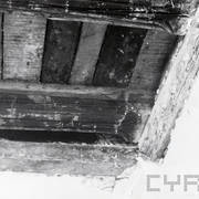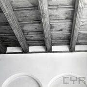 Strop renesansowy w kamienicy nr 41 w pierzei wschodniej Starego Rynku między ulicami Wielką i Woźną, w głębi otwory w murze wykute w celu osadzenia dźwigarów02.1958