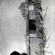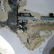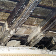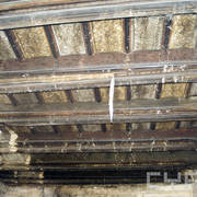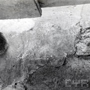 Strop nad parterem (rozebrany), końcówki belek i murłata po zbiciu tynku w ścianie południowej kamienicy nr 83 w zachodniej pierzei Starego Rynku04.1958