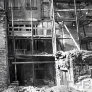 Wnętrze kamienicy nr 41 w pierzei wschodniej Starego Rynku w czasie powojennej odbudowy, ciemny trakt środkowy z wątkiem muzru z cegły gotyckiej na ścianie północnej05.1955