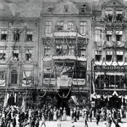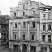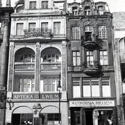Kamienice nr 57 i 58 w południowej pierzei Starego Rynku, fotografia wykonana prawdopodobnie po 1905 roku po przejęciu sklepu z odzieżą damską w kamienicy nr 57 przez Mieczysława Malinowskiego a przed jej przebudową przeprowadzoną w 1909 r.