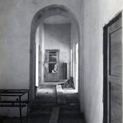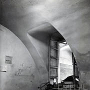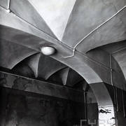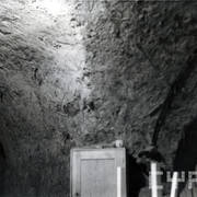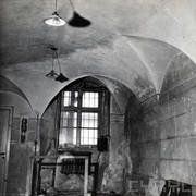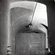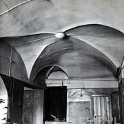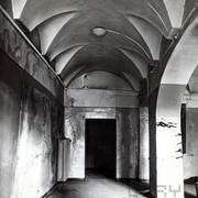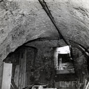 Wnętrze kamienicy nr 41 w pierzei wschodniej Starego Rynku w czasie powojennej odbudowy, ciemny trakt środkowy na parterze, sklepienie kolebkowe z oknem do traktu przyrynkowego05.1955