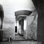 Wnętrze kamienicy nr 41 w pierzei wschodniej Starego Rynku w czasie powojennej odbudowy, trakt środkowy na parterze z drzwiami do traktu przyrynkowego05.1955