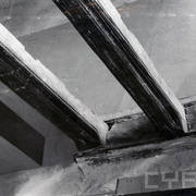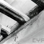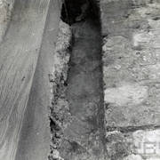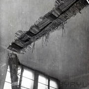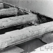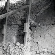 Rozebrany strop nad parterem w kamienicy nr 83 w zachodniej pierzei Starego Rynku, belki końcowe przy trakcie środkowym - widok na ścianę południową04.1958
