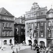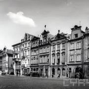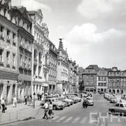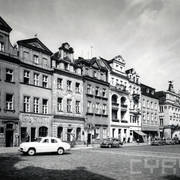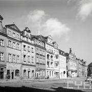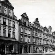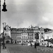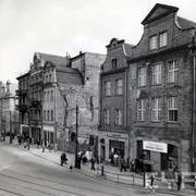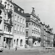 Kamienice nr 70-76 w zachodniej pierzei Starego Rynku, z prawej fragment modernistycznego budynku Galerii Miejskiej Arsenał, na pierwszym planie figura św. Jana Nepomucena03.10.1977