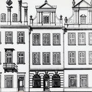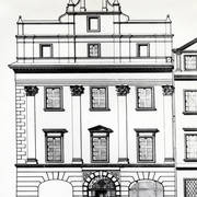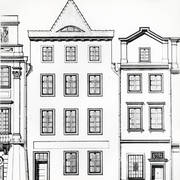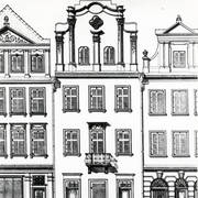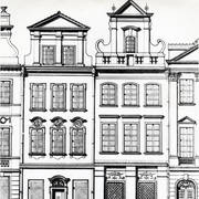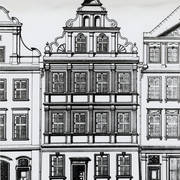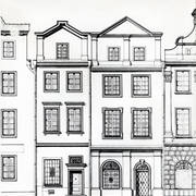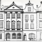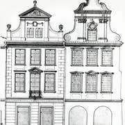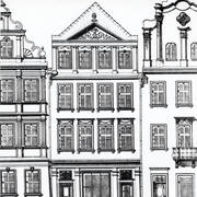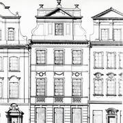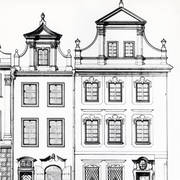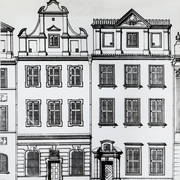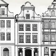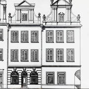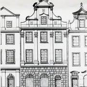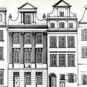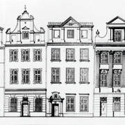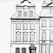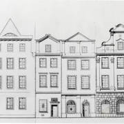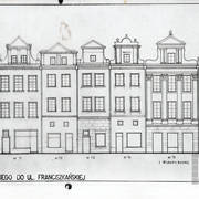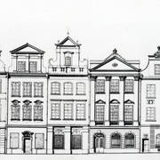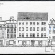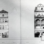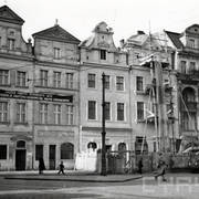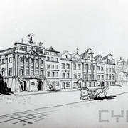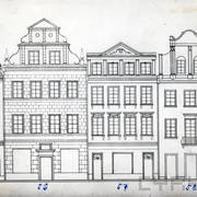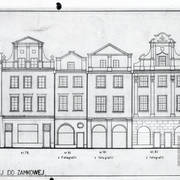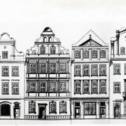 Zarys elewacji rekonstruowanych kamienic nr 73 i 74 wkomponowanych w zachodnią pierzeję Starego Rynku między ul. Paderewskiego i ul. Franciszkańską, przed 1950 rokiem