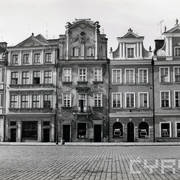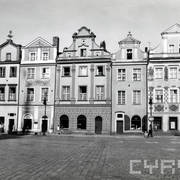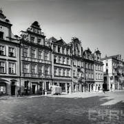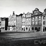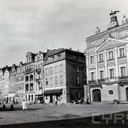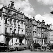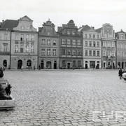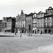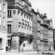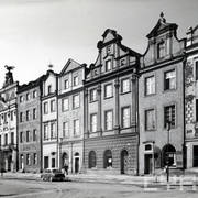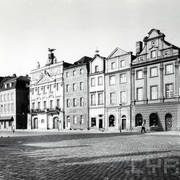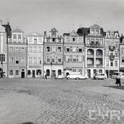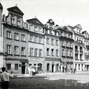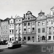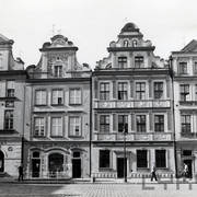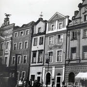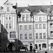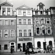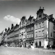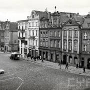 Odbudowane po zniszczeniach wojennych pałac Działyńskich (pierwszy z lewej) i kamienice w zachodniej pierzei Starego Rynku między ul. Franciszkańską i ul. Zamkową, około 1960 roku