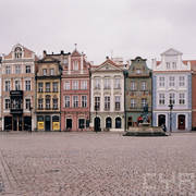 Odbudowana po zniszczeniach wojennych kamienica nr 79 w zachodniej pierzei Starego Rynku, z lewej rusztowania ustawione przy pałacu Działyńskich09.1956