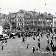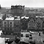 Widok z wieży ratuszowej na fragment zabudowy pierzei południowej między ul. Świętosławską i ul. Wrocławską w czasie odbudowy po zniszczeniach wojennych, w tle, z lewej fara1953