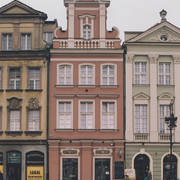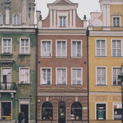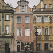 Odbudowana po zniszczeniach wojennych kamienica nr 79 w zachodniej pierzei Starego Rynku, z lewej rusztowania ustawione przy pałacu Działyńskich10.1956