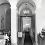 Wnętrze kamienicy nr 41 w pierzei wschodniej Starego Rynku w czasie powojennej odbudowy, trakt przyrynkowy na parterze, ściana działowa z łukiem koszowym oddzielająca część północną od południowej05.1955
