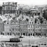 Widok z ratusza na fragment zachodniej pierzei Starego Rynku w okolicy ul. Franciszkańskiej, zabezpieczone fasady zniszczonych w czasie wojny kamienicy nr 77 i pałacu Działyńskich, w tle kościół Franciszkanów na Górze Przemysła09.1951