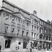 Zniszczone w czasie działań wojennych pałac Działyńskich (na pierwszym planie) i kamienice w zachodniej pierzei Starego Rynku między ul. Franciszkańską i ul. Zamkową1945