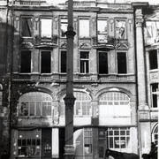 Zniszczone w czasie działań wojennych kamienice w południowej pierzei Starego Rynku od ul. Świętosławskiej do ul. Wrocławskiej, na pierwszym planie figura św. Jana Nepomucena07.06.1945