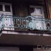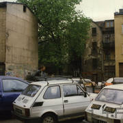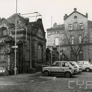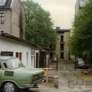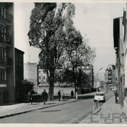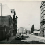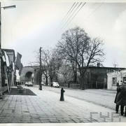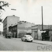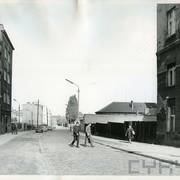 Ulica Kościelna w miejscu, w którym rozwidla się na dwie jezdnie ze skwerem pośrodku, po lewej fragment kamienicy nr 15, dalej nieistniejący, piętrowy dom pod nrem 17, w głębi nieistniejące zabudowania wytwórni płyt gramofonowych Mewa10.1968