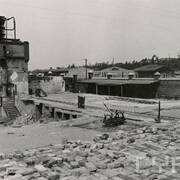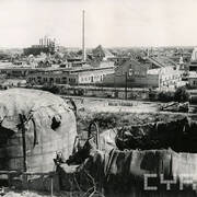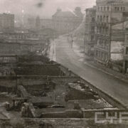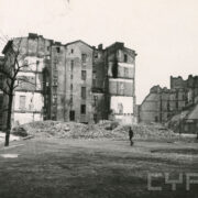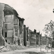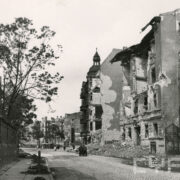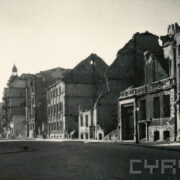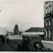 Budynek Pracowni Rzeźby i Ceramiki Państwowej Wyższej Szkoły Sztuk Plastycznych w Poznaniu przy ul. Jackowskiego 5/7, po prawej wieża kościoła garnizonowego przy ul. Szamarzewskiego 307.06.1948