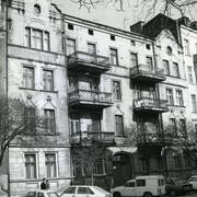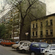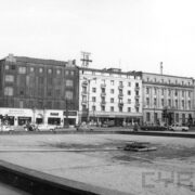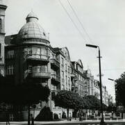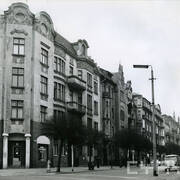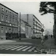 Ulica Zwierzyniecka, w środku wieżowiec Zjednoczenia Przemysłu Ceramiki Budowlanej, z prawej fragment secesyjnej kamienicy nr 20, lata 70. lub 80. XX wieku
