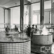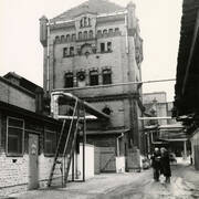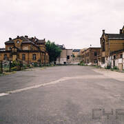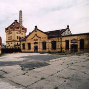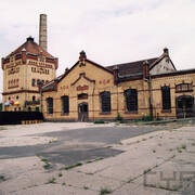 Zabudowania rzeźni miejskiej na Garbarach, od lewej: hala uboju cieląt i owiec, wieża ciśnień i maszynownia (hala maszyn), w głębi komin kotłowni16.06.2011