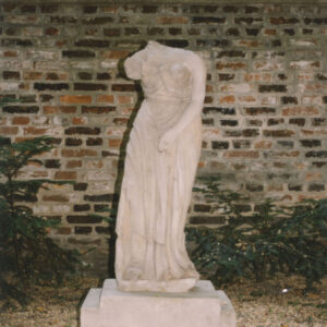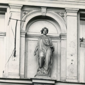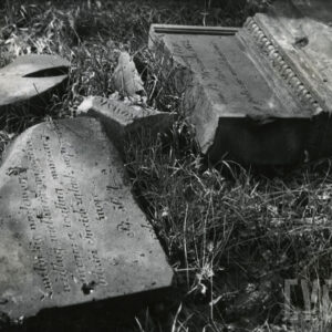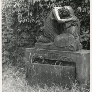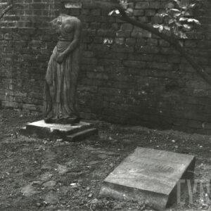 Uszkodzona rzeźba figuralna i płyta nagrobna Józefy Müller w kwaterze I Cmentarza Zasłużonych Wielkopolan