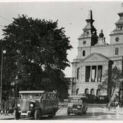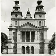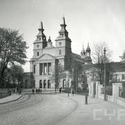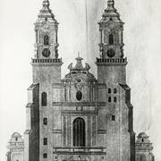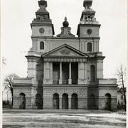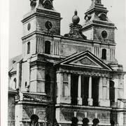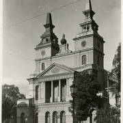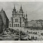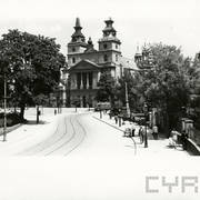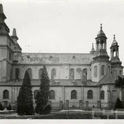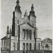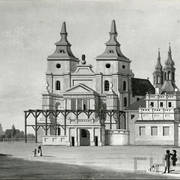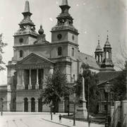 Klasycystyczna fasada katedry w dwudziestoleciu międzywojennym, z prawej pomnik Jana Kochanowskiego (obecnie zrekonstruowany stoi przed Muzeum Archidiecezjalnym mieszczącym się w dawnym budynku Akademii Lubrańskiego)1929