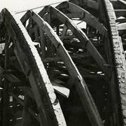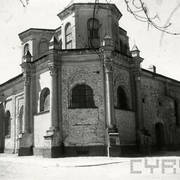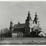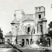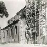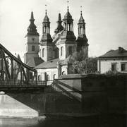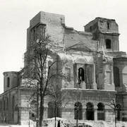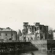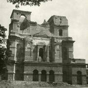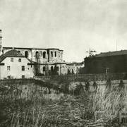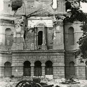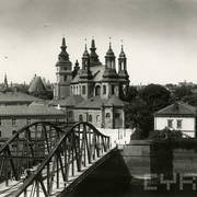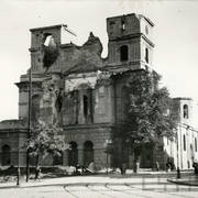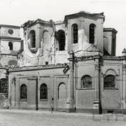 Zniszczona katedra od strony prezbiterium, z lewej drewniany most Cybiński wybudowany krótko po wojnie na miejscu prowizorycznej przeprawy z czasów okupacji1945–1946