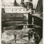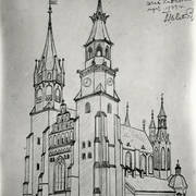 Ostrów Tumski na rysunku Napoleona Ordy (most Tumski na ulgowym korycie Warty, mury obronne z bramą, psałteria, kościół Najświętszej Marii Panny i katedra)1878–1880