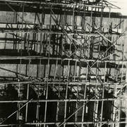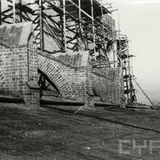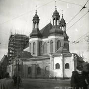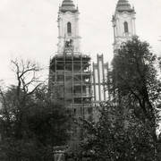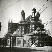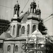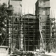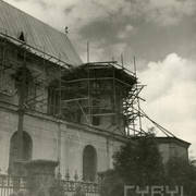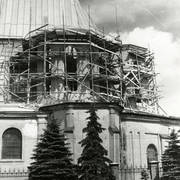 Odbudowane po zniszczeniach wojennych barokowe hełmy wieżyczek - latarni katedry od strony wschodniej, rusztowania ustawione przy Złotej Kaplicy07.1953