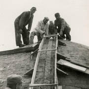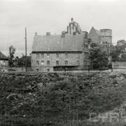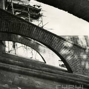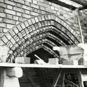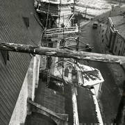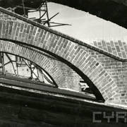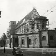 Odbudowa katedry po zniszczeniach wojennych, z lewej dach nawy głównej, poniżej dach nad kaplicami bocznymi od strony południowej z jedną z trzech wieżyczek, z prawej fragment pałacu arcybiskupiego, w tle most Cybiński20.11.1952