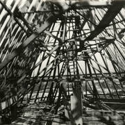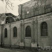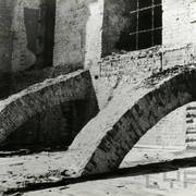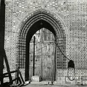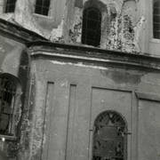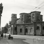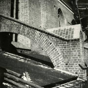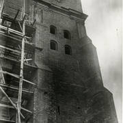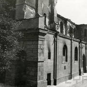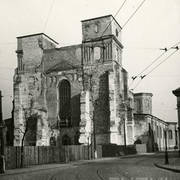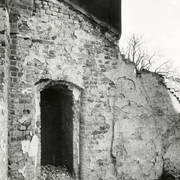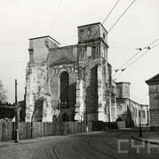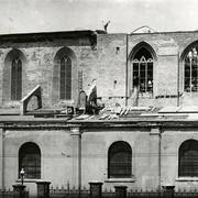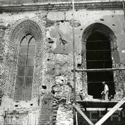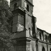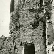 Zniszczona wieża południowa od strony prezbiterium, widoczne wejście (?) z nieistniejącego ganku biegnącego niegdyś nad ulicą z pałacu biskupiego do katedry1945
