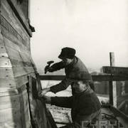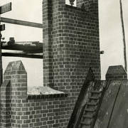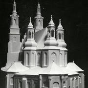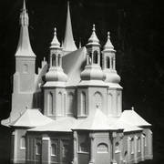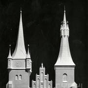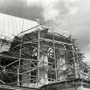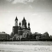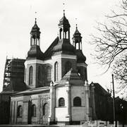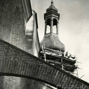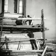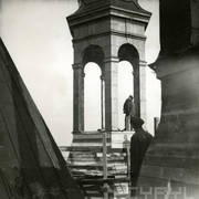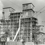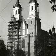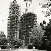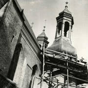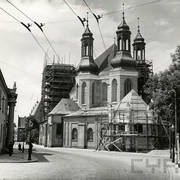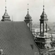 Odbudowane po zniszczeniach wojennych barokowe hełmy wieżyczek - latarni katedry od strony wschodniej, rusztowania ustawione przy wieży południowej10.1953
