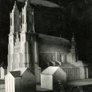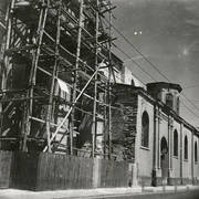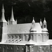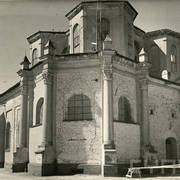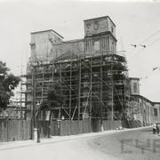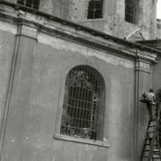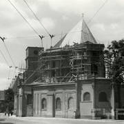 Odbudowane po zniszczeniach wojennych barokowe hełmy wieżyczek - latarni katedry od strony wschodniej, rusztowania ustawione przy Złotej Kaplicy, z lewej fragment pałacu arcybiskupiego1953