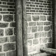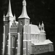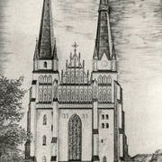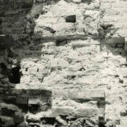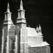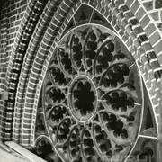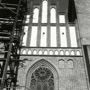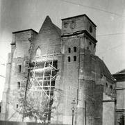 Fasada katedry w początkowej fazie odbudowy po usunięciu elementów klasycystycznych: dolna partia kamiennego lica wieży południowej z 2 połowy XI lub XII wieku i sięgające wyżej lico ceglane (XII/XIV wiek, po połowie XIV wieku - ok. 1430)1948
