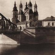 Warciański kanał ulgi wypełniony wodą, most Bolesława Chrobrego i Ostrów Tumski z psałterią, kościołem NMP i katedrą od zachodu przed 1939 rokiem1925–1939