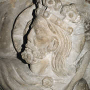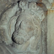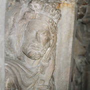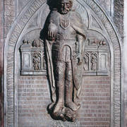 Zachowana ze zniszczonego gotyckiego nagrobka Bolesława Chrobrego płaskorzeźba przedstawiająca Chrystusa Króla będąca fragmentem sarkofagu Mieszka I i Boleslawa Chrobrego w Złotej Kaplicy w katedrze1998