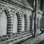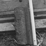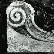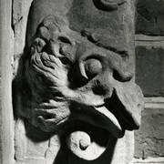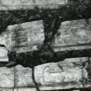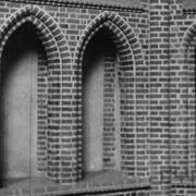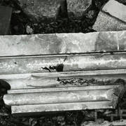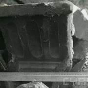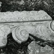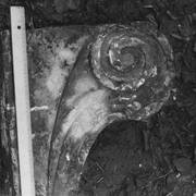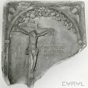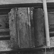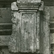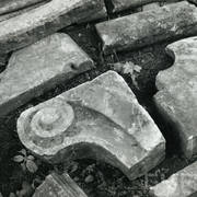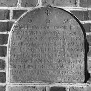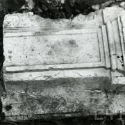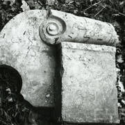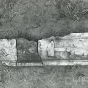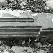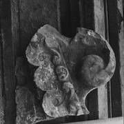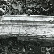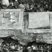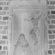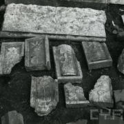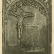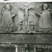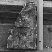 Fragment piaskowcowej płyty epitafijnej z krucyfiksem w arkadzie i fragmentem inskrypcji (brak klęczącej postaci zmarłego) prezentowana w lapidarium1978