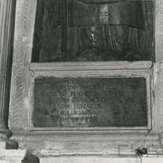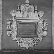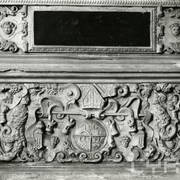 Dziewiętnastowieczna tablica inskrypcyjna i detal z kartuszem herbowym na późnorenesansowym nagrobku biskupa Łukasza Kościeleckiego (zm. 1597) w kaplicy św. Franciszka Ksawerego w katedrze1970–1979