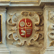 Kartusz herbowy z herbami: Ogończyk, Oksza, Grzymała, Sulima na późnorenesansowym nagrobku biskupa Łukasza Kościeleckiego (zm. 1597) w kaplicy św. Franciszka Ksawerego w katedrze1970–1979