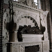 Piaskowcowy nagrobek piętrowy Anny (zm. 1598) i Janusza (zm. 1595) Przecławskich sprowadzony w 1954 roku ze zrujnowanego kościoła w Chojnicy pod emporą katedry1979