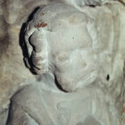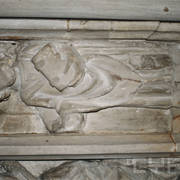 Kartusz z herbami Poraj, Leliwa, Łabędź, Korczak, fragment renesansowego, piętrowego nagrobka Andrzeja I Górki, kasztelana poznańskiego i starosty generalnego Wielkopolski (zm. 1551) i jego żony Barbary z Kurozwęk (zm. 1545)1998
