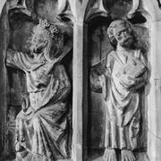Sarkofag Mieszka I i Bolesława Chrobrego w Złotej Kaplicy w katedrze, dwie pierwsze płaskorzeźby z prawej strony przedstawiające św. Piotra i Chrystusa pochodzą ze zniszczonego gotyckiego nagrobka Bolesław Chrobrego1951