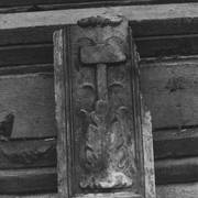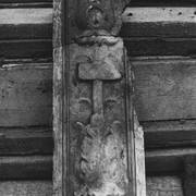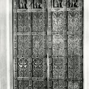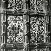 Ornament roślinny i Oksza - herb szlachecki abpa Floriana Stablewskiego na neorenesansowych, dwuskrzydłowych drzwiach brązowych do kaplicy Serca Jezusowego1974