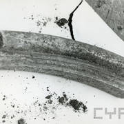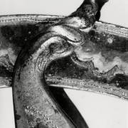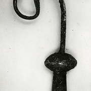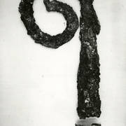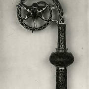 Srebrny pastorał z 2. połowy XII wieku z wolutą zakończoną schematyczną główką zwierzęcą odnaleziony w czasie powojennych wykopalisk archeologicznych w grobie nr 931953